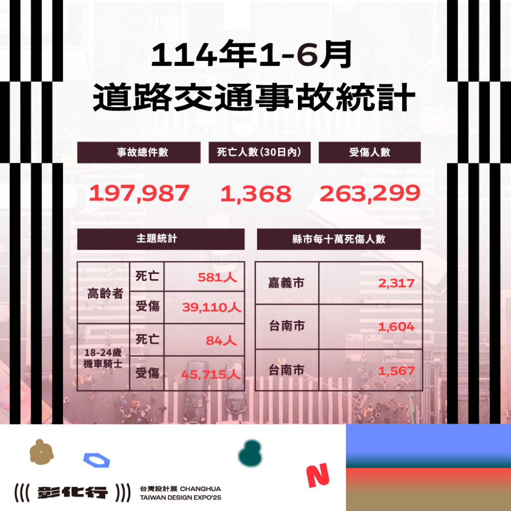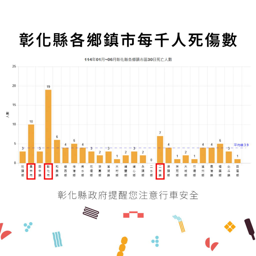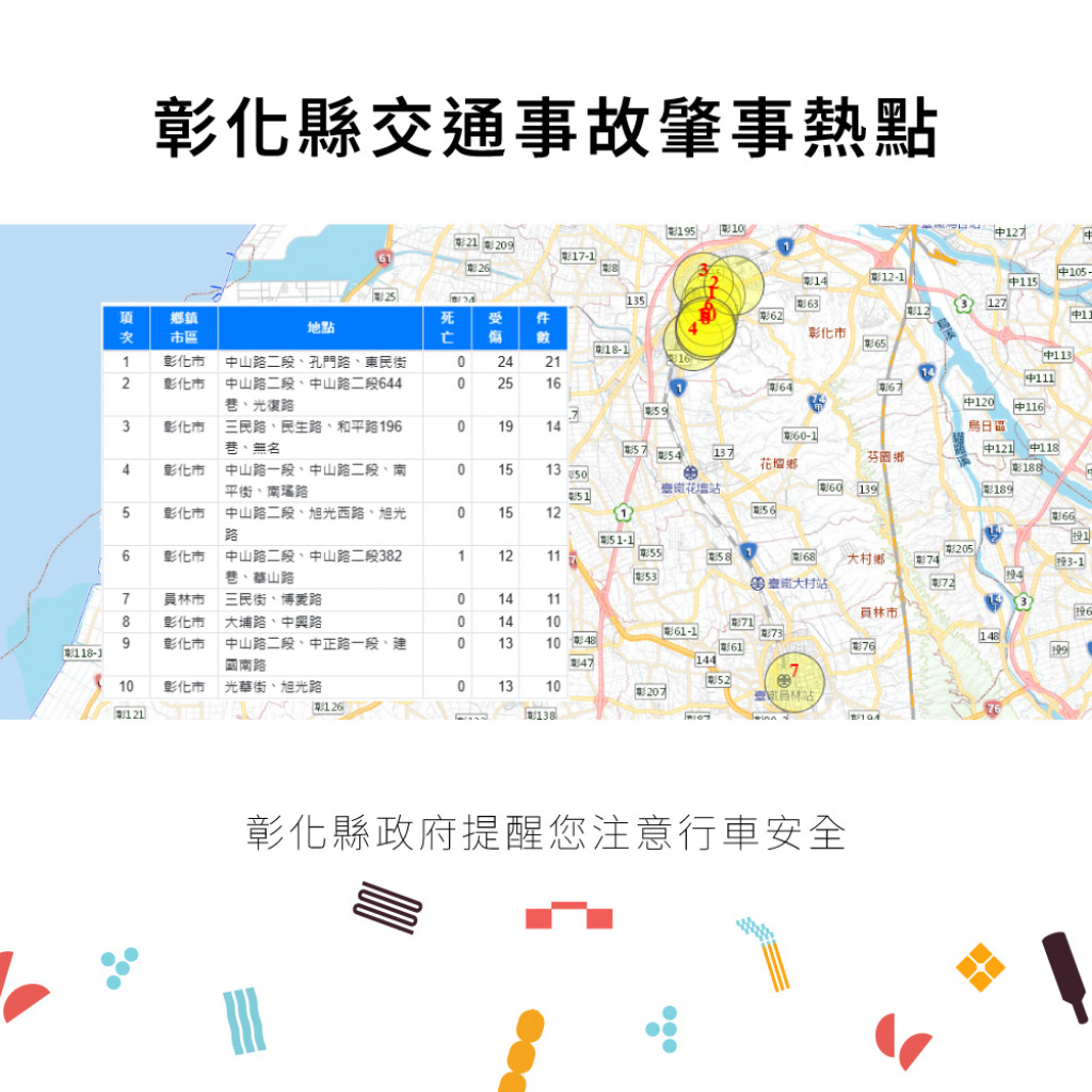 二、 | 根據交通部道安資訊查詢網統計快覽數據跟112年同期比較分析,以少年自行車騎士(含電自、電輔) 事故增加47.7%最高,外籍人士事故增加38.6%次之,自小客車駕駛人增加25.4%再次之。1-6月份30日鄉鎮市每千人死傷人數於「彰化市、員林市、二林鎮」為多,肇事熱點以「彰化市」為多。 |