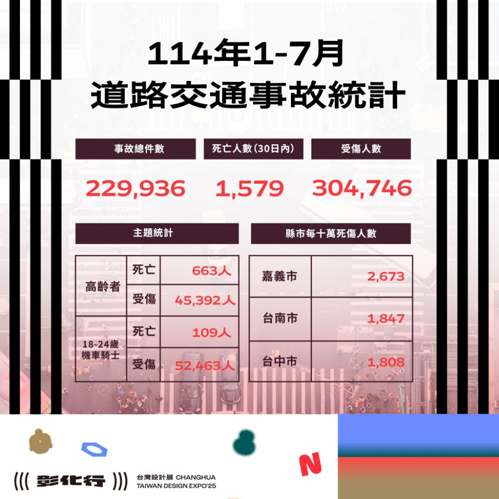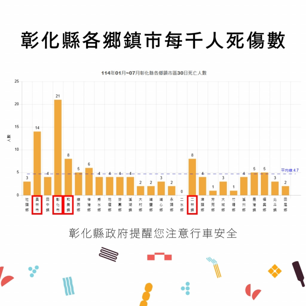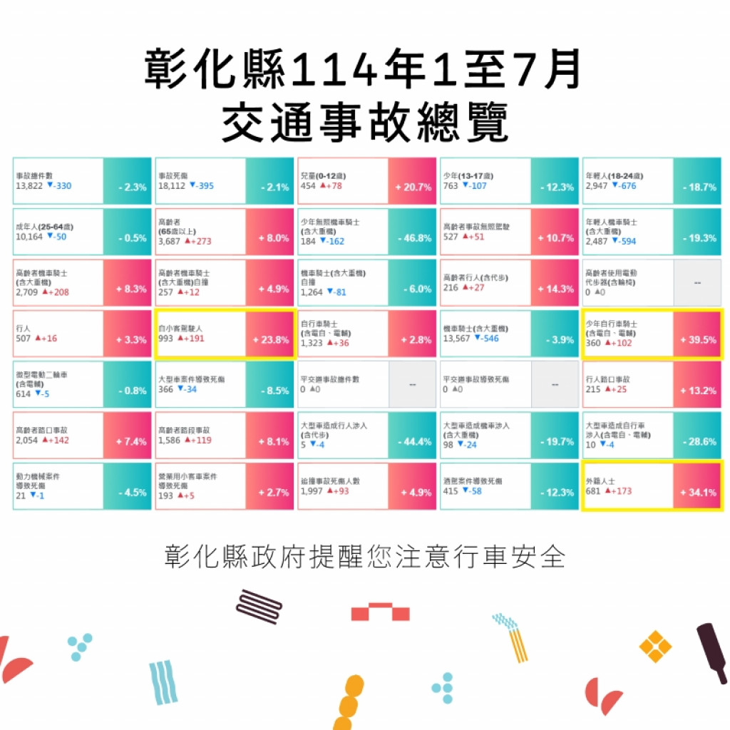 | 二、 | 根據交通部道安資訊查詢網統計快覽數據跟112年同期比較分析,以少年自行車騎士(含電自、電輔) 事故增加39.5%最高,外籍人士事故增加34.1%次之,自小客車駕駛人增加23.8%再次之。1-7月份30日鄉鎮市每千人死傷人數於「彰化市、員林市、二林鎮、和美鎮」為多,肇事熱點以「彰化市」為多。 |