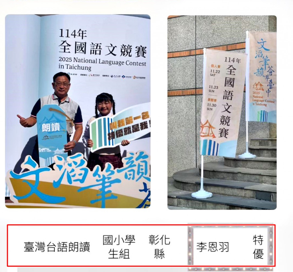 恭喜六年戊班李恩羽同學 參加114年全國語文賽,榮獲國小組 - 臺灣台語朗讀比賽特優 ( 指導老師 : 吳明村主任 )