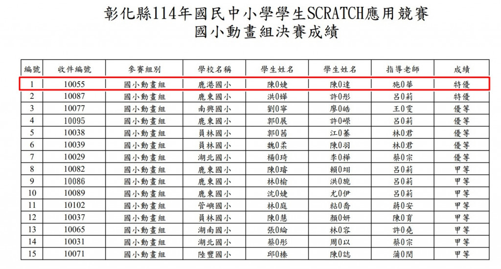 恭喜本校學生參加114學年度彰化縣SCRATCH 程式競賽決賽榮獲佳績 : 國小動畫組特優 : 六丙陳穎婕,六戊陳羿達 國小遊戲組特優 : 六甲謝侑恩,六乙顏辰宇 以上四位同學將代表彰化縣參加115年度全國貓咪盃SCRATCH程式競賽。