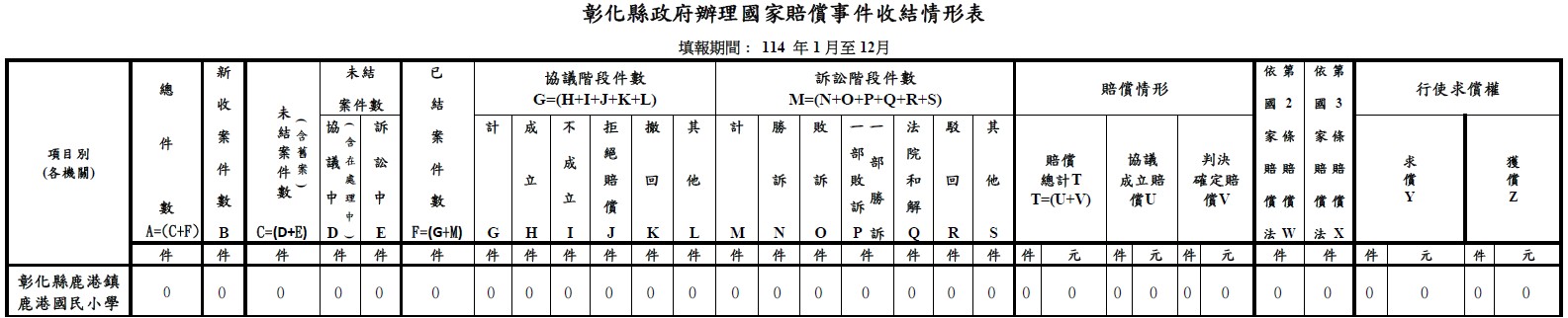依據政府資訊公開法第7條第1項第5款規定,公開辦理國家賠償事件收結情形表。
