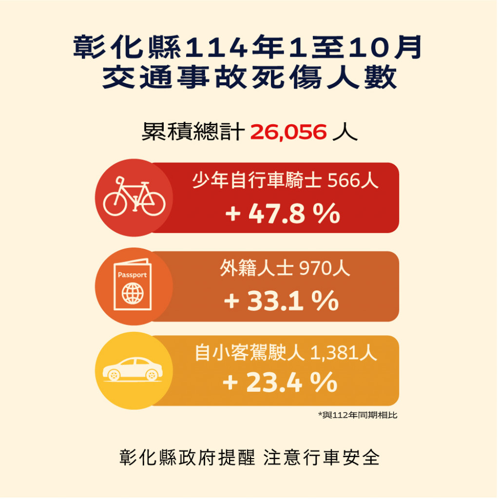 本縣114年1-10月道路交通事故死傷累計26,056人,根據交通部道安資訊查詢網,本縣114年1-10月道路交通事故與112年同期比較分析,以少年自行車騎士(含電自、電輔) 事故增加47.8%最高,外籍人士事故增加33.1%次之,自小客車駕駛人增加23.4%再次之。1-10月份鄉鎮市30日死亡人數於「彰化市、員林市、二林鎮、鹿港鎮」為多,肇事熱點以「彰化市」為多。 |