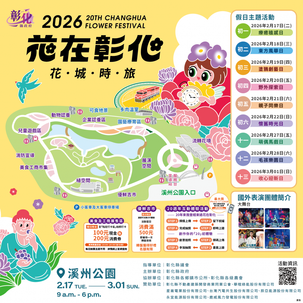 一、2026花在彰化將於2月17日(初一)到3月1日(十三)在溪州公園盛大舉行。適逢活動舉辦20週年,特別以「花城時旅」為主題,透過趣味與互動並重的設計,邀請共同見證彰化花卉之美。