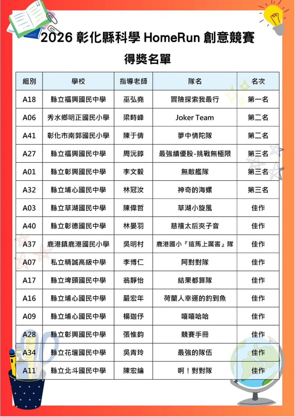 六乙陳尚佑 、六丁詹烽秦、六戊彭暄容 、六戊陳昀萱同學參加2026科學HomeRun創意競賽榮獲國中小組佳作
