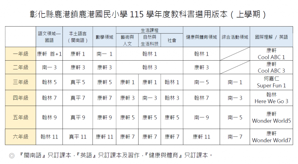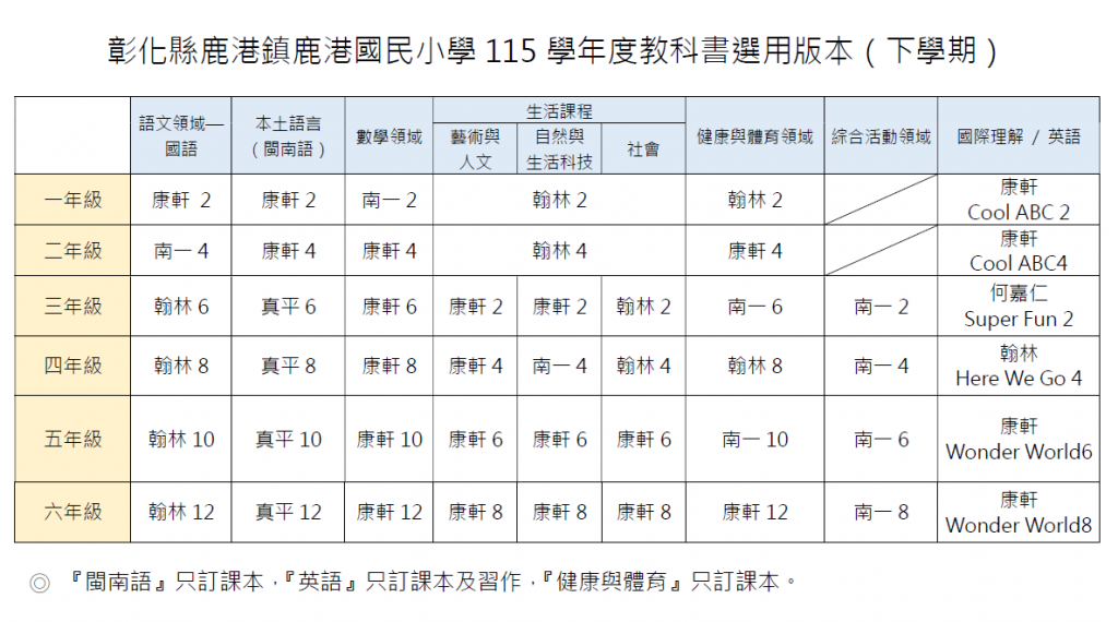 115學年度鹿港國小教科書版本公告